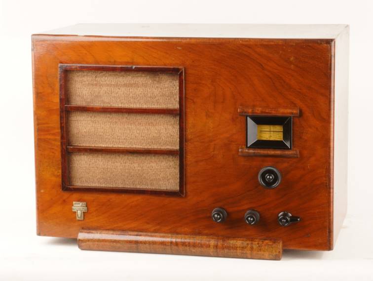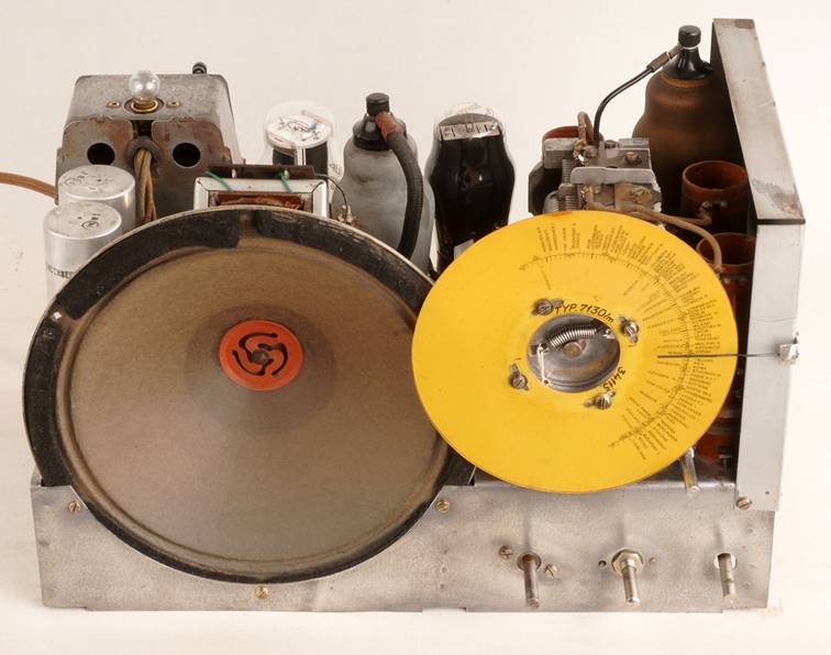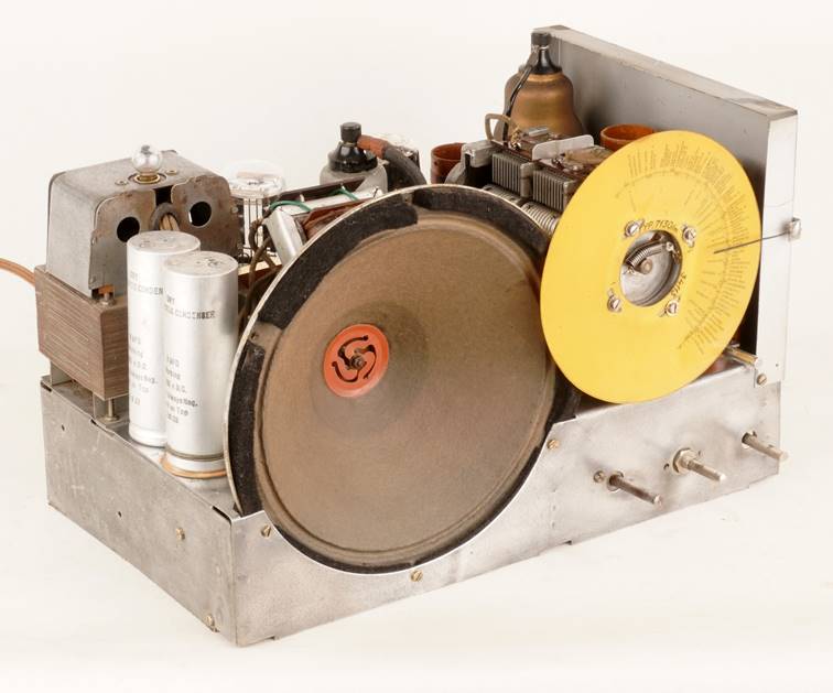 Superhetempfänger in Reflexschaltung, die Einstellung der Lautstärke erfolgt im Antennenkreis.