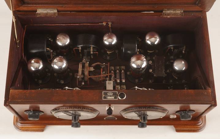 Superhetempfänger mit Rahmeneantenne nach dem Ultradyneprinzip, Oszillator- und Eingangskreis sind separat abzustimmen.